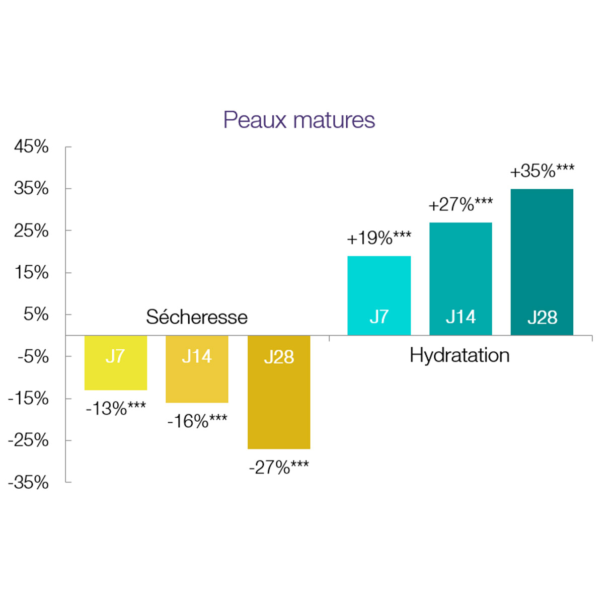Peau hydratée dès 2h et jusqu'à x60 au bout de 28j vs placebo. Inhibe la perte en eau et en urée.